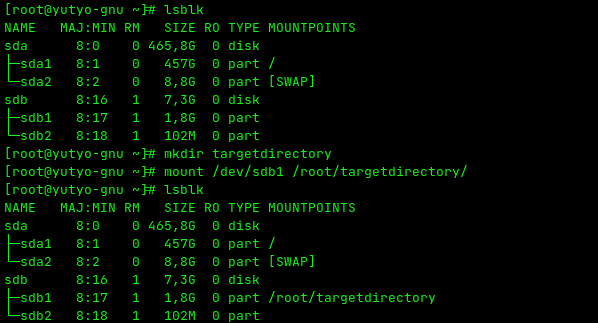 예를 들어, /dev/sdb1이라는 USB 장치를 /mnt/usb 디렉토리에 마운트하면, 해당 디렉토리를 통해 USB 안의 파일에 접근할 수 있게 됩니다. 반대로 연결을 끊는 것을 umount라고 합니다.