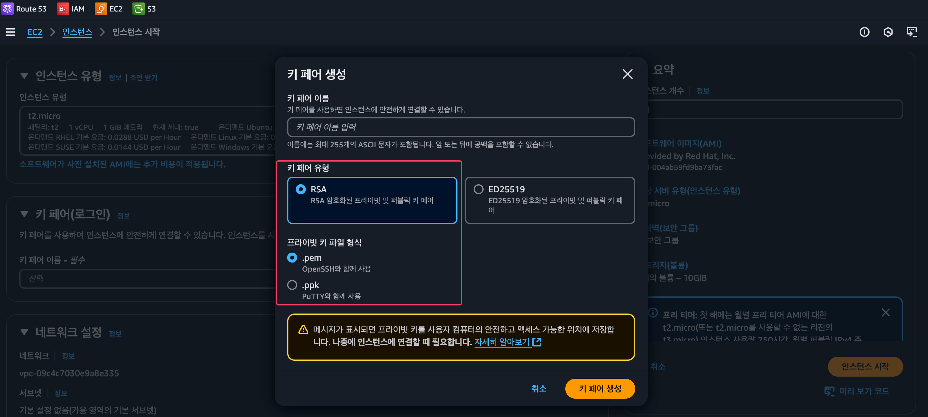 SSH 접속을 위해서는 키 페어가 필요합니다. MacOS에서는 Terminal을 통해 SSH 접속이 바로 가능하므로 .pem으로 선택합니다.